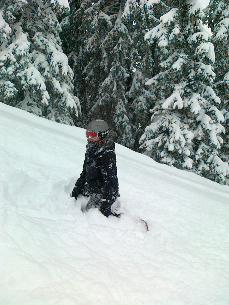 V polovině sjezdovky odpočíváme. Vítr bodá, z nosu kape jak z vodovodu.